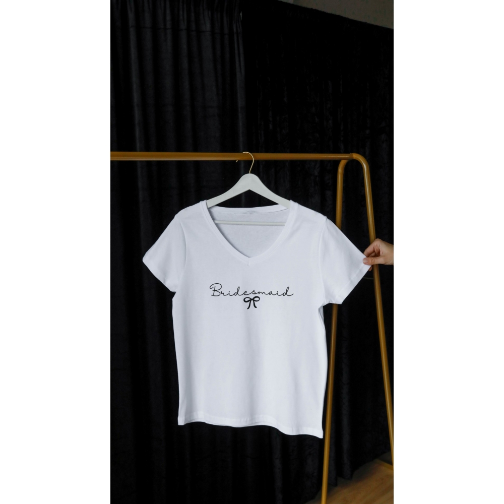Bridesmaid baskı detaylı V yakalı beyaz tişort. %100 pamuk özel dikim tişort kullanılmıştır.