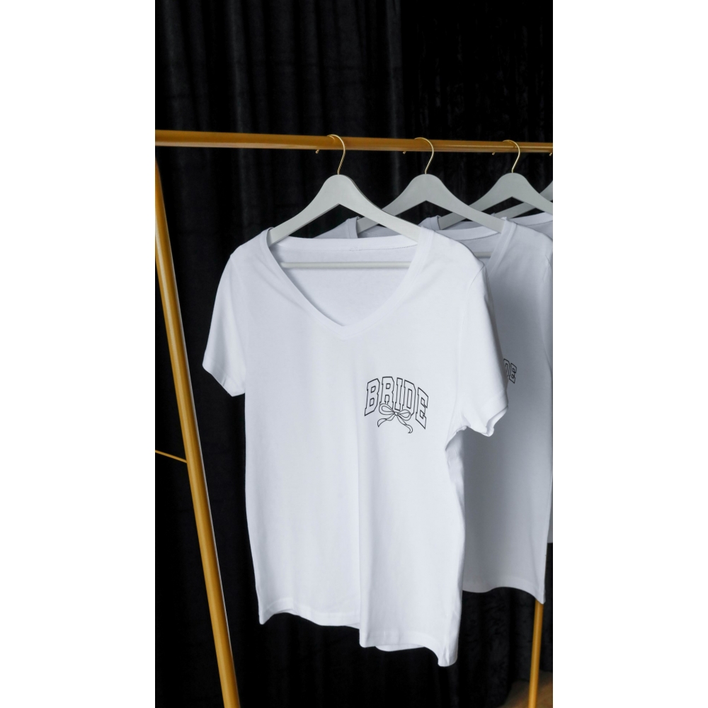 Bride baskı detaylı V yakalı beyaz tişort. %100 pamuk özel dikim tişort kullanılmıştır.